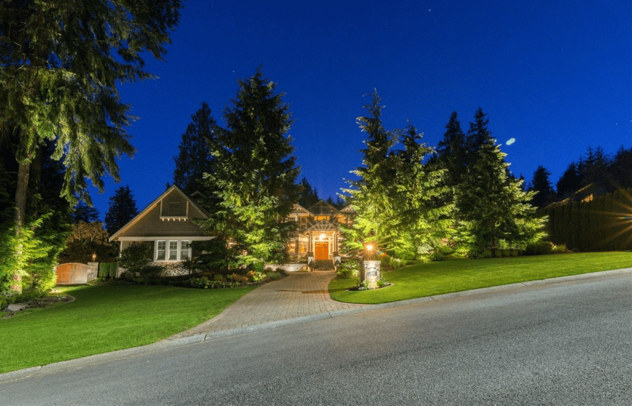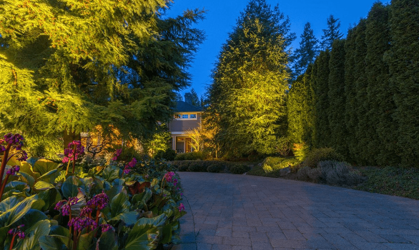 The lighting around these evergreens serves a dual purpose: it magnifies their stature, making them visually commanding elements that frame the home's façade, and it enhances the property's visibility from the street, giving it a prominent and impressive presence in the neighborhood. This attention to detail in lighting design not only highlights the home's architectural features but also accentuates the natural beauty of the evergreens, providing a welcoming sight that is both functional and artistically pleasing.