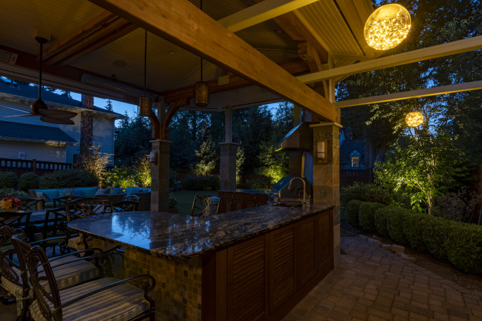 Tucked behind a traditional brick and lap-sided home in Kenmore, Washington, this cozy backyard renovation blends privacy, practicality, and elegance. With a total of 32 lights in our warm 2700K "sunset" tone, we illuminated this multi-use space with intention. Whether the homeowners are grilling beneath the covered kitchen, hosting guests at the granite-topped bar, or simply relaxing under the stars, their evenings are now enhanced by a lighting design that’s both beautiful and functional.