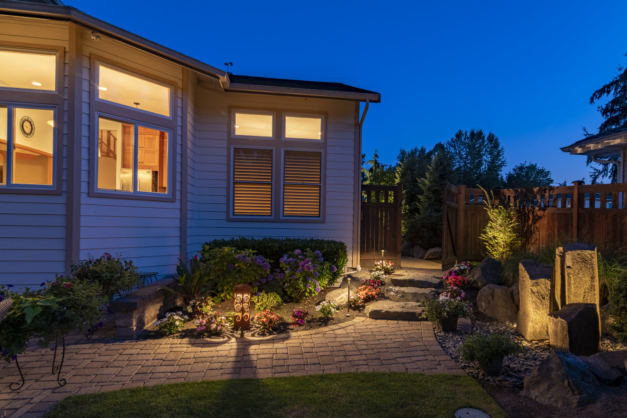 This project was all about layers—soft path lighting, integrated sconces, pendant globes, and softly lit evergreens that transform the space into a serene outdoor experience.
