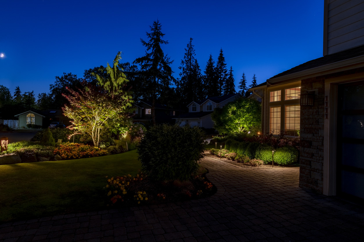 The transformation of this Kenmore backyard is night and day—literally. Before lighting, the backyard's charm and functionality disappeared after dark. Now, layered lighting brings the kitchen, trees, and pathways to life. The “after” view showcases how architectural and landscape features were elevated through thoughtful lighting.